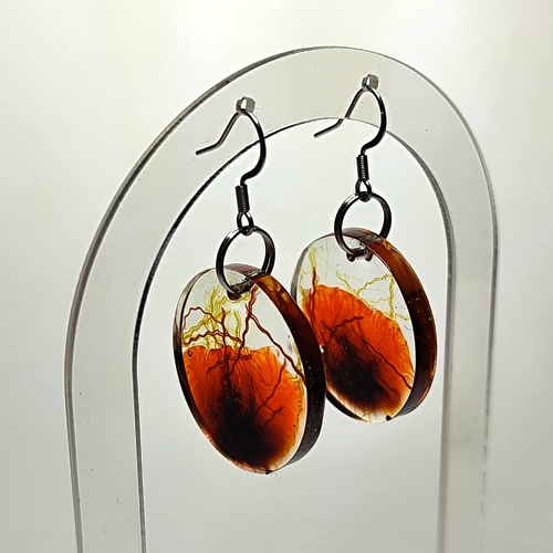 Boucles d’oreilles rondes en résine avec inclusion de fils de soie et encre orange et noire, réalisées à la main. Ces fils sont les reliquats de fil utilisé pour les création en dentelle.