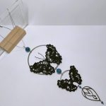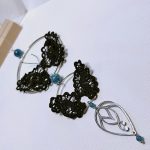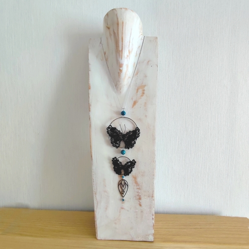 Ce collier élégant met en scène deux papillons en dentelle à la fourche, entièrement réalisés à la main en fil de soie française noir.