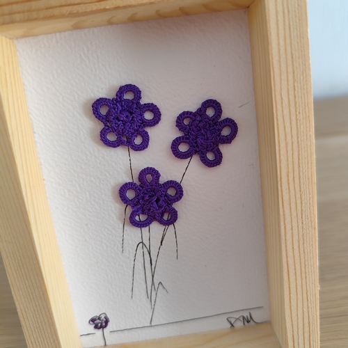 Ce mini-cadre, à poser ou à suspendre, est réalisé en dentelle à la fourche, une technique artisanale ancestrale que je travaille pour créer des motifs fins et contemporains. Les fleurs sont en fil de soie française violet, choisi pour sa luminosité et sa douceur, qui apporte une texture délicate et un éclat naturel à ce tableau.