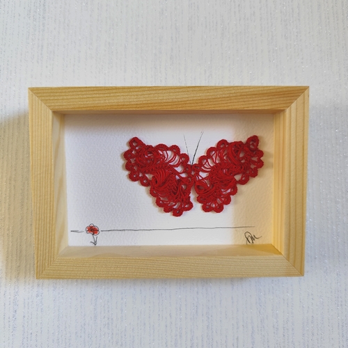 Un petit cadre à suspendre, réalisé en dentelle à la fourche, une technique artisanale ancestrale que je travaille pour créer des motifs fins et contemporains. Comme un cadre entomologique, il présente un magnifique papillon de dentelle rouge vif, choisi pour sa luminosité et sa vivacité, qui apporte une texture délicate et un éclat naturel à ce tableau.